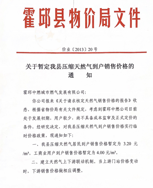 關(guān)于暫定我縣壓縮天然氣到戶銷(xiāo)售價(jià)格的通知