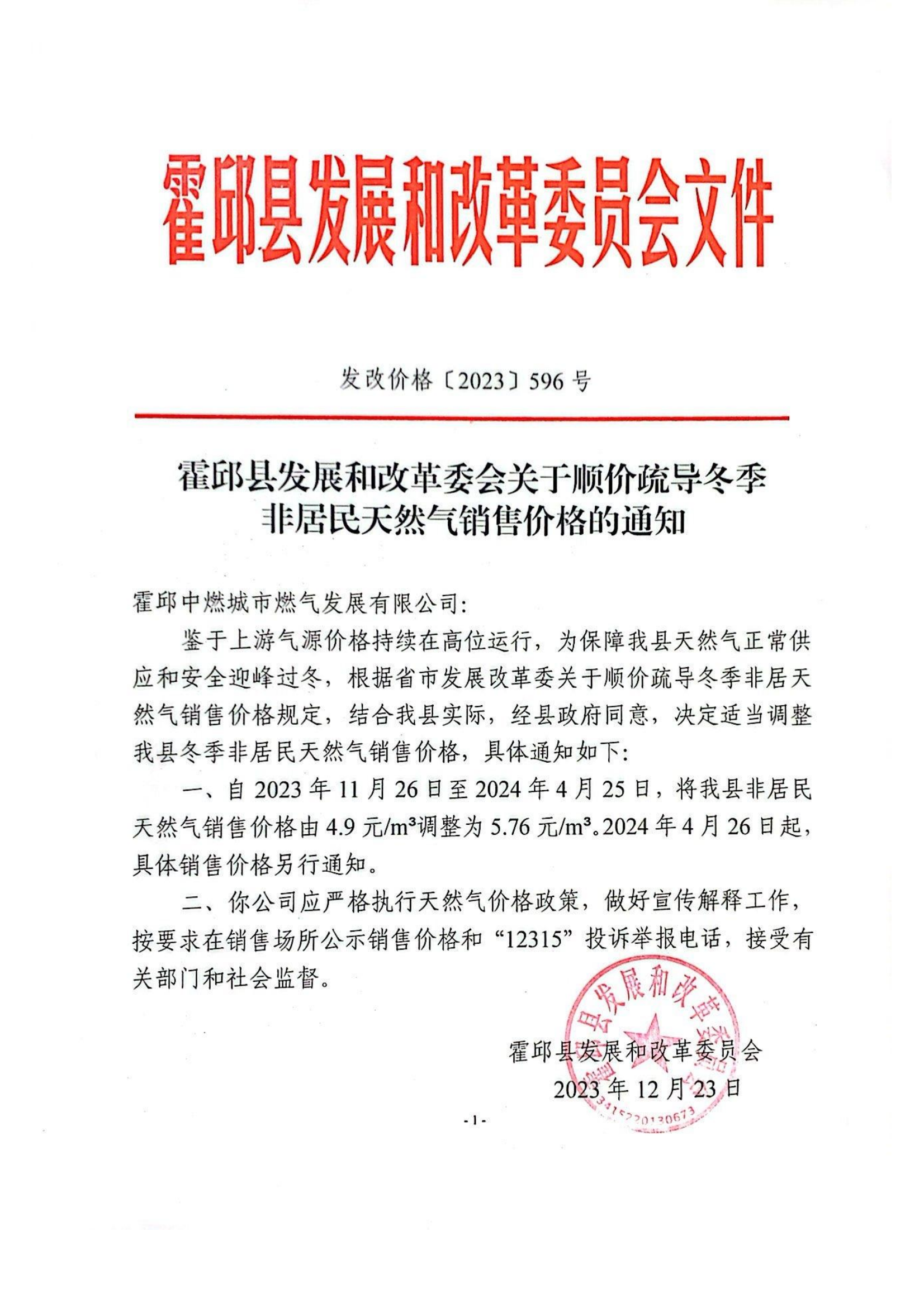 霍邱縣發(fā)展和改革委會關(guān)于順價疏導(dǎo)冬季非居民天然氣銷售價格的通知