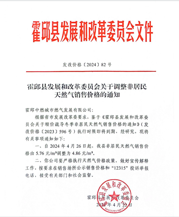 霍邱縣發(fā)展和改革委員會(huì)關(guān)于調(diào)整非居民天然氣銷售價(jià)格的通知