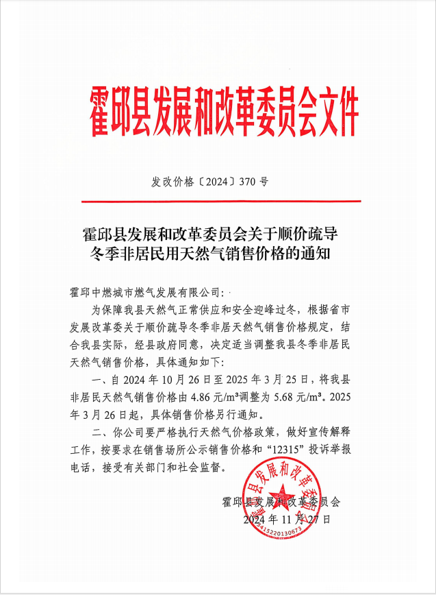 霍邱縣發(fā)展和改革委員會(huì)關(guān)于順價(jià)疏導(dǎo)冬季非居民用天然氣銷售價(jià)格的通知