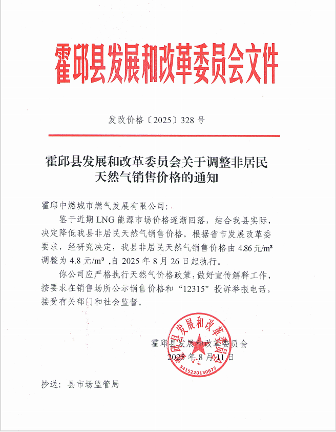 霍邱縣發(fā)展和改革委員會(huì)關(guān)于調(diào)整非居民天然氣銷(xiāo)售價(jià)格的通知