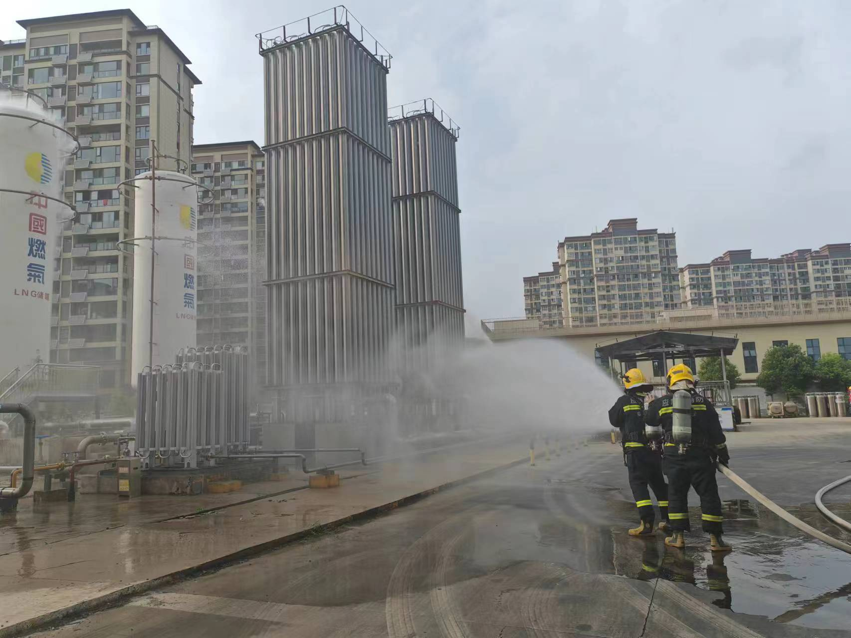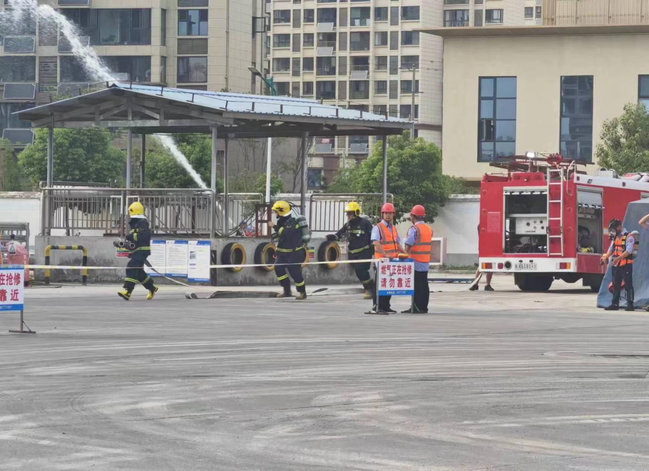 隨著總指揮羅健的一聲令下,演練正式開始。演練以城區(qū)場站LNG儲罐下方連接管損壞,造成大量燃?xì)庑孤┑木o急事件為背景,主要包括:報警、應(yīng)急響應(yīng)、現(xiàn)場警戒、人員疏散、搶救傷員、險情控制、搶修作業(yè)和恢復(fù)供氣8個科目。演練中,巡檢人員發(fā)現(xiàn)險情,立即報告調(diào)度室,關(guān)閉總電源、向消防等主管部門報告??傊笓]立即啟動應(yīng)急預(yù)案,應(yīng)急救援小組迅速就位各司其職,消防救援大隊配合我司消防組人員利用消防設(shè)施對泄漏區(qū)域進(jìn)行噴淋稀釋,同時設(shè)置警戒隔離無關(guān)人員進(jìn)入,疏散人員撤離到安全地帶,搶險組穿戴低溫防護(hù)服對傷員進(jìn)行救援、對現(xiàn)場險情進(jìn)行處置,搶險完成檢測合格后恢復(fù)供氣。